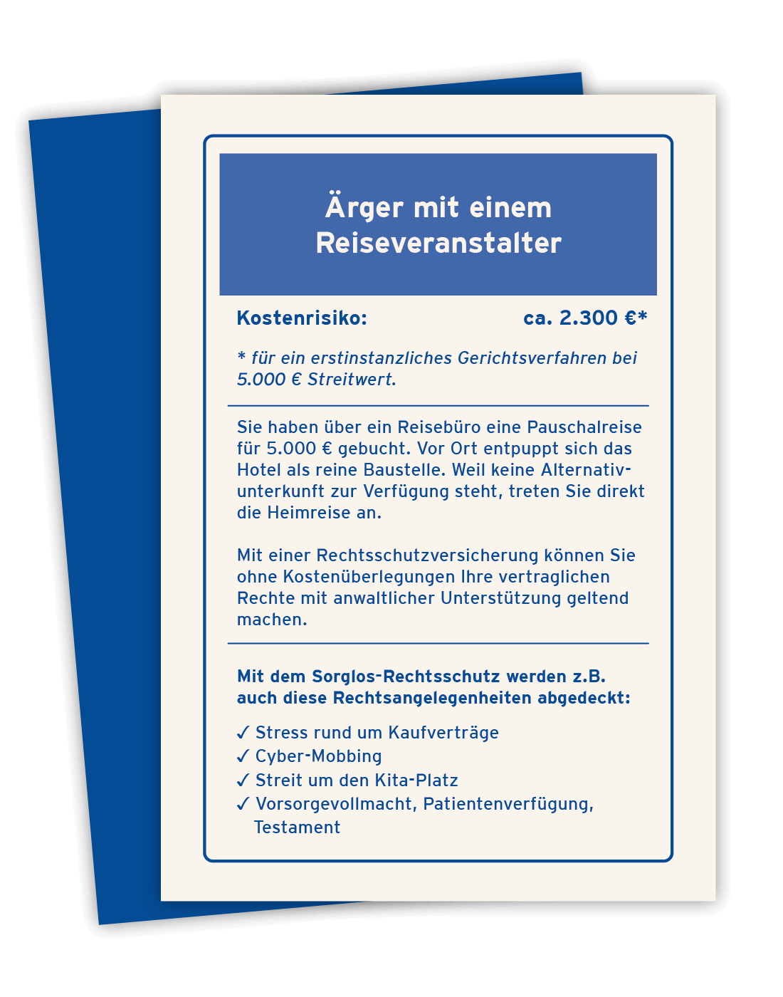 Im privaten wie beruflichen Alltag können Sie unerwartet in Situationen geraten, in denen das Durchsetzen Ihres Rechts mit erheblichen Risiken verbunden ist. Besonders ein Rechtsstreit vor Gericht kann schnell hohe Kosten verursachen – oft weit über dem eigentlichen Streitwert. Langwierige Verfahren, schwer kalkulierbare Gutachterkosten und ein unsicherer Ausgang stellen ein großes finanzielles Risiko dar, das viele davon abhält, ihr gutes Recht einzufordern.